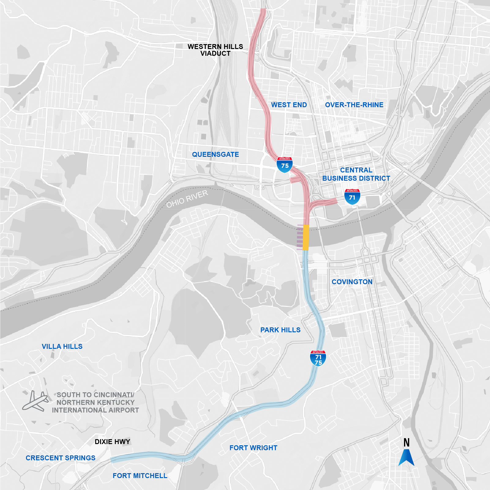 The Brent Spence Bridge is the centerpiece of a nationally-recognized corridor for freight and interstate travel that covers eight miles from the Western Hills Viaduct in Ohio to Dixie Highway in Kentucky. The bridge carries Interstates 71 and 75 across the Ohio River between Ohio and Kentucky.